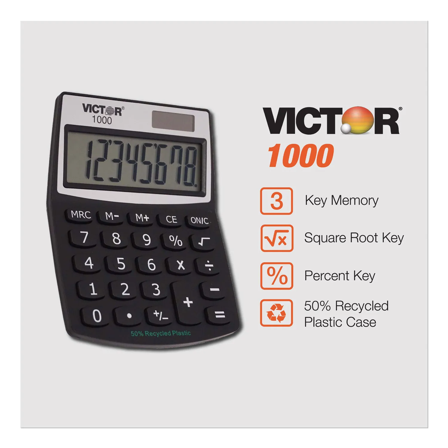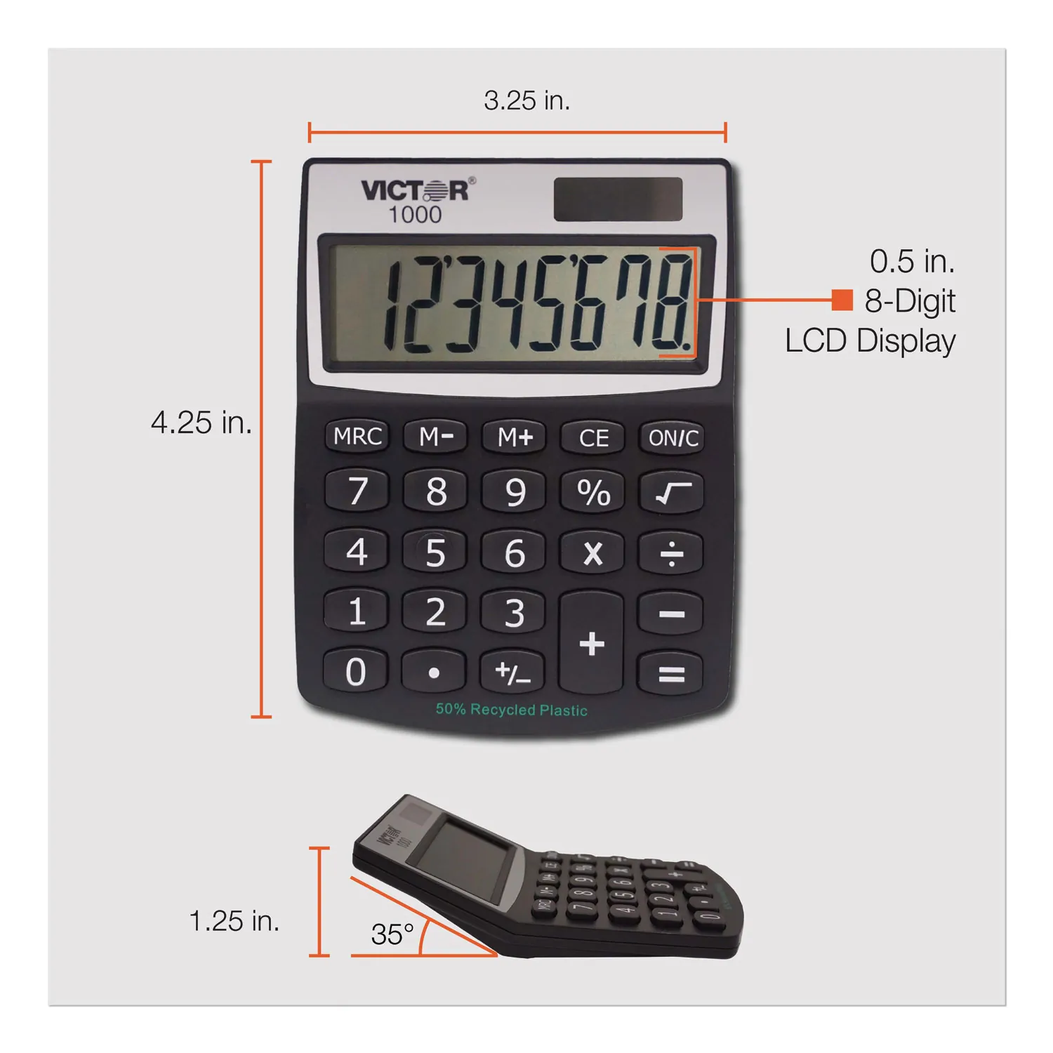 Victor 1100-3A Victor Mini Desktop Calculator Large Display Angled Display Dual Power Independent Memory Environmentally Friendly Battery Backup Batterysolar Powered Battery Included 1.1" Height X 4.5" Width X 5" Depth X 5" Length White Blue Silver Plastic 1 Each