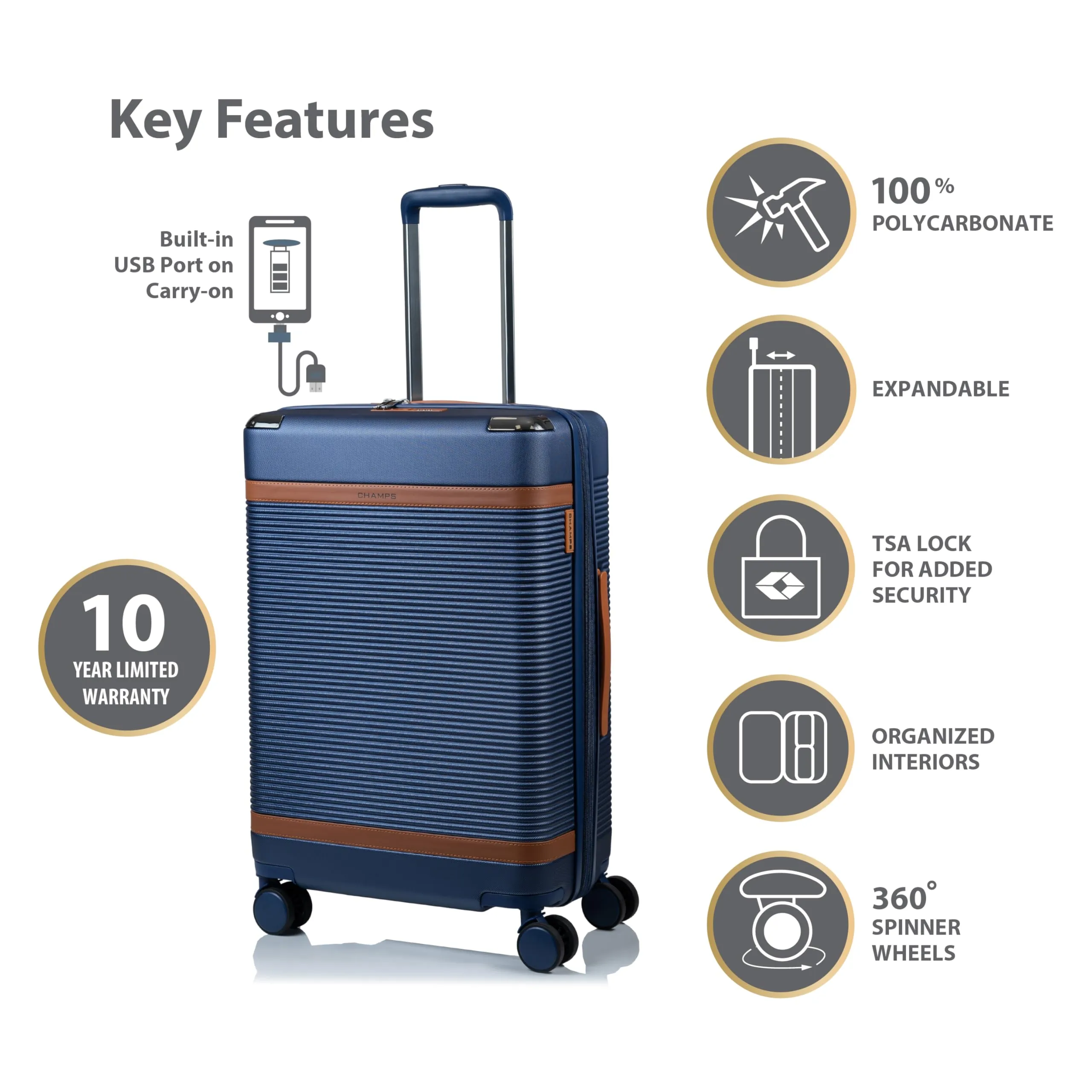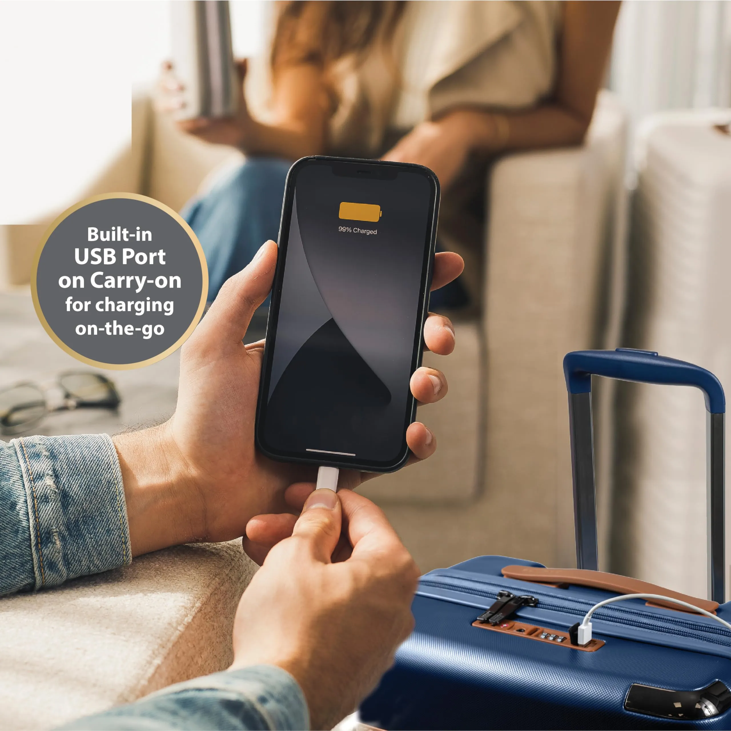 - Built-in USB port on Carry-on for on-the-go charging (cable included, power bank not included)