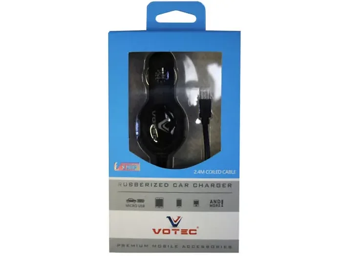 Bulk CA657 Votec Coiled Black Micro Usb Car Charger With Cable