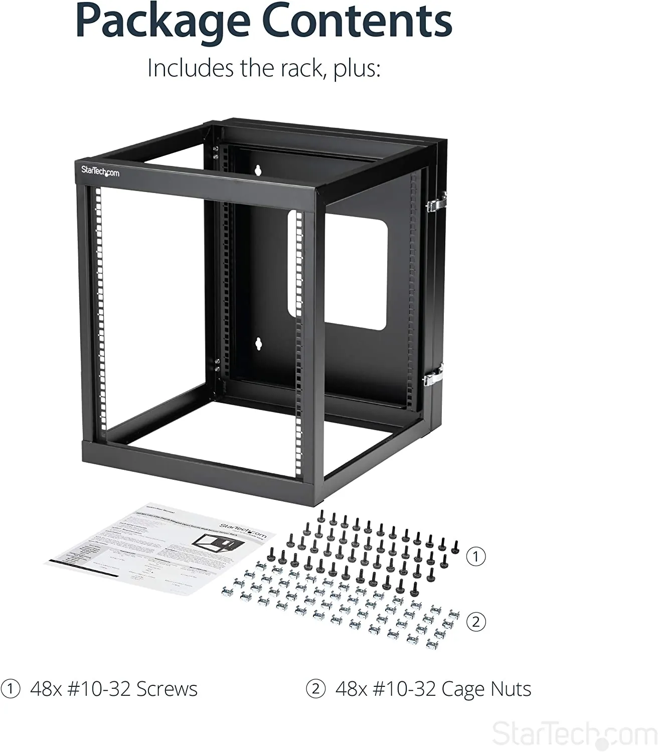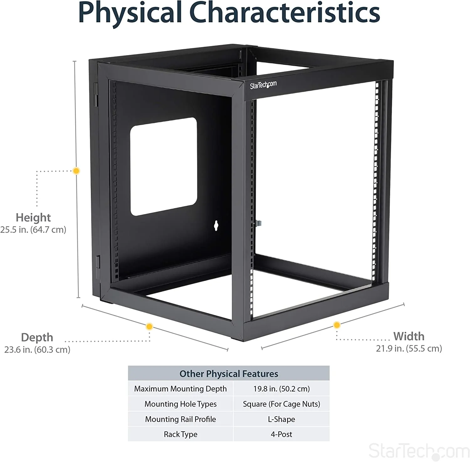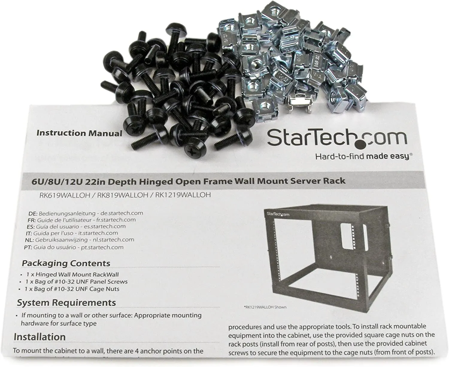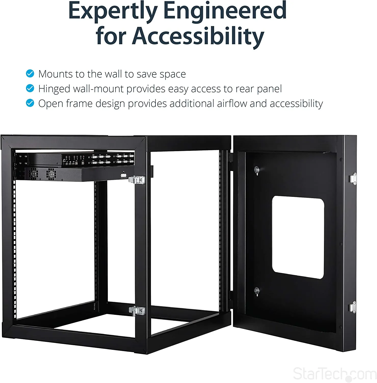 StarTech.com 12U Hinged Open Frame Wall Mount Server Rack - 4 Post 22 in. Depth Network Equipment Rack Cabinet - 140 lbs capacity (RK1219WALLOH),Black