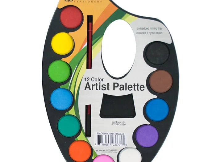 Perfect for aspiring artists, this Watercolor Paint Artist Palette features a durable plastic palette with 12 paint colors, a cutout hole for easy holding, an embedded mixing tray and a nylon bristle paint brush. Measures approximately 10" long x 6.75" wide with a 5" long paint brush. Comes shrink wrapped.