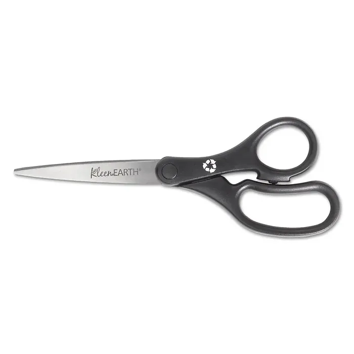 8" lightweight scissors are designed for comfort and precision control. Comfortable, ambidextrous basic handle is earth-friendly. Straight black handles contain a high percentage of recycled plastic. Lightweight, sharp blades are made of precision-ground stainless steel for durability. KleenEarth Basic Recycled Scissors are designed for left-handed or right-handed users.