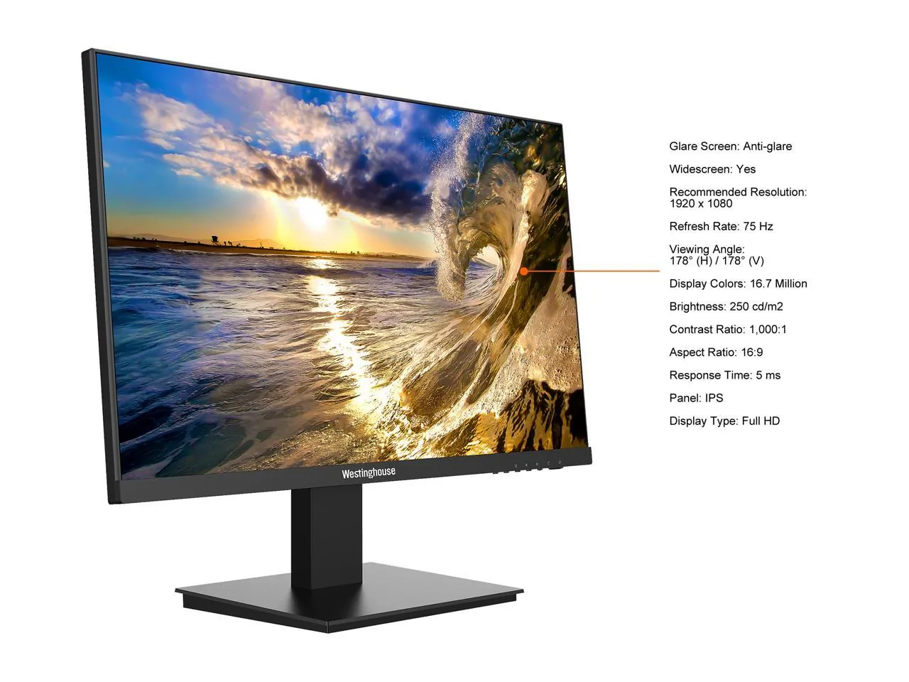 The Westinghouse WH27FX9320 27" Full HD monitor offers stunning visuals and immersive viewing experiences. With a resolution of 1920 x 1080 and a refresh rate of 75 Hz, this monitor is perfect for both work and entertainment. Its IPS technology ensures vibrant colors and wide viewing angles, making it ideal for multimedia use.