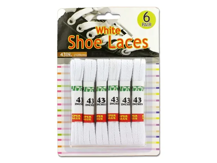 Great for sneakers and more, this 6-pair White Shoe Laces Set features high quality pairs of white, woven polyester shoe laces. Laces measure approximately 43" long x 1/4" wide. Comes packaged in a blister pack.