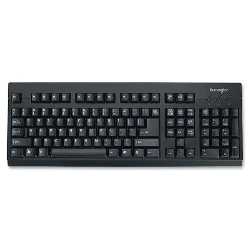 Spill safe keyboard from Kensington. Metal back plate and spill-safe design that protects electronics from liquid damage. Slim profile design saves workspace while PS2/USB compatibility allows use with both older and newer computers. Black in color.