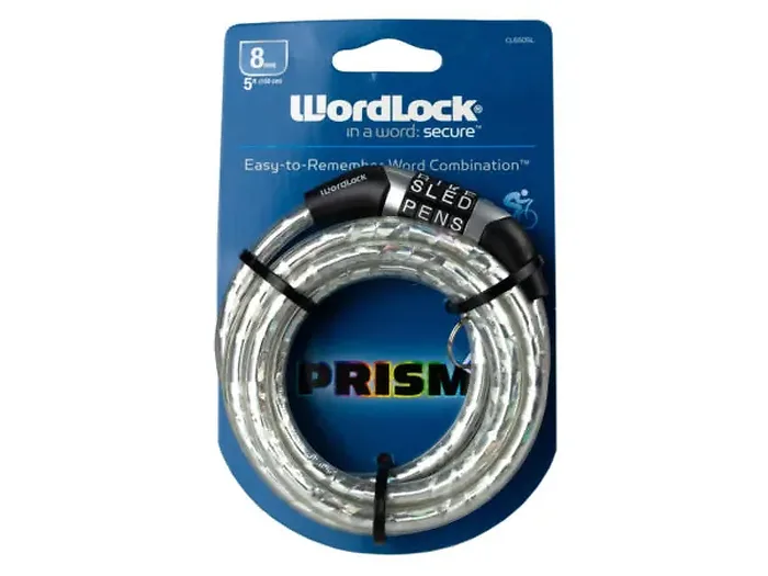 Secure your bike with ease using the WordLock Flexible Bike Lock. This innovative lock uses a customizable word combination instead of numbers for added convenience and memorability. Measuring 8mm in thickness and 5 feet in length, it's perfect for any bike. Designed to withstand all weather conditions, this lock comes in a variety of vibrant colors, ensuring your bike not only stays safe but also looks stylish. Packaged conveniently in a 6.85" x 4.25" hanging panel, it's a practical choice for cyclists.
