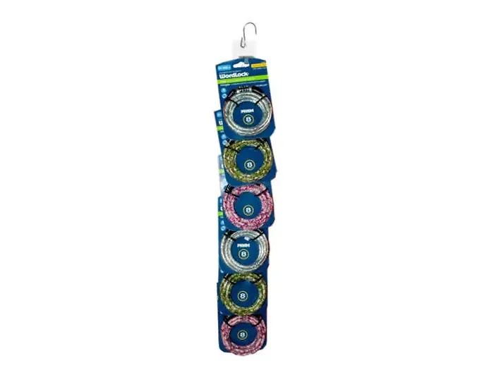 Secure your bike with a memorable word combination using the WordLock 8mm x 5 Ft Flexible Bike Lock. Designed for all-weather use, this innovative lock features a customizable word code that eliminates the hassle of remembering numbers. Each lock comes conveniently packaged in a compact 6.85" x 4.25" hanging panel displayed on a clip strip, which includes eight assorted colors to choose from.