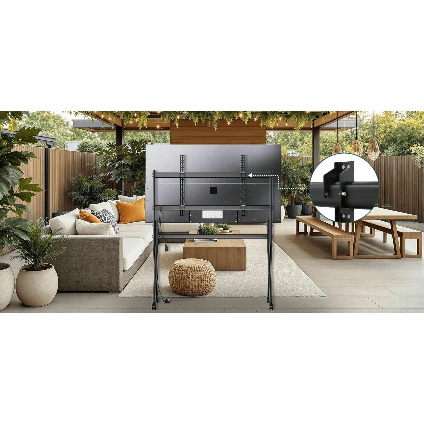 Sylvox S50MCMA0 Outdoor TV Y-Type Rolling TV Cart is a robust and versatile mobile stand designed to enhance your outdoor viewing experience. Crafted from high-grade steel, its Y-type dual-pillar structure ensures superior stability and can support TVs ranging from 65 to 120 inches with a maximum weight capacity of 150 kg (330 lbs). The cart features smooth-rolling, lockable wheels for effortless mobility and secure placement. Its height-adjustable design allows you to customize the viewing angle for optimal comfort. Compatible with VESA patterns up to 1200x600mm, this rolling TV cart is perfect for patios, poolside areas, and other outdoor settings, providing a seamless blend of functionality and convenience